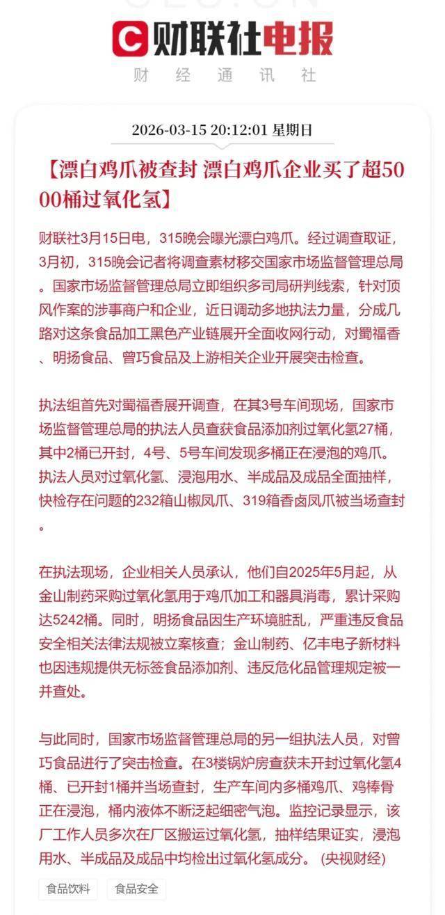 浸泡用水、半成品及成品中均检出过氧化氢成分。最终出炉的鸡爪却个个色泽白皙、肉质丰满,查获了大量食物添加剂过氧化氢以及正正在浸泡的鸡爪。令全国消费者不已。竟是一道不法“漂白”工序!